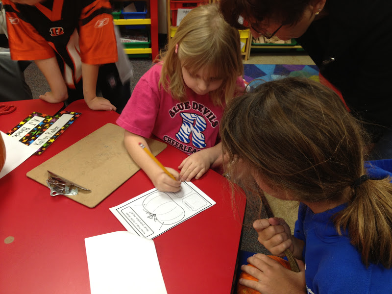 On Friday my student’s fourth grade buddies came by and we did Cara’s, The Great Pumpkin Investigation.  My students and their buddies, loved this activity.  It really was so much fun to watch students working hard to investigate their pumpkin.