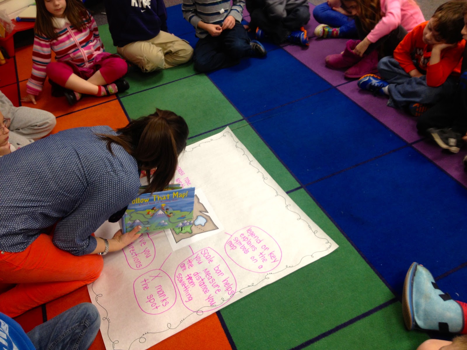 Also we started our unit with the book Follow that Map! Â Here is my student teacher completing a bubble map of what the kids know about maps. Â Our as we call it, our map schema.