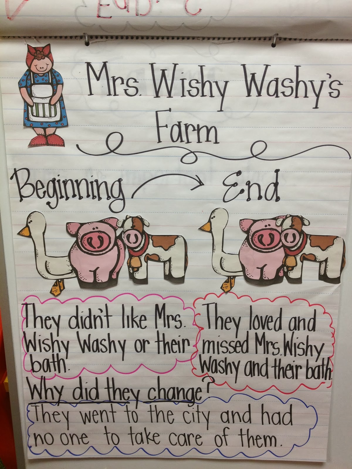 Last week we read Mrs. Wishy Washy’s Farm. If you haven’t read this Mrs. Wishy book, you must. It’s one of my favorites. On Monday we discussed how characters sometimes change in a story. We discussed how an event in the story creates this change. The kids helped me fill out the following chart, and they completed their own as well.