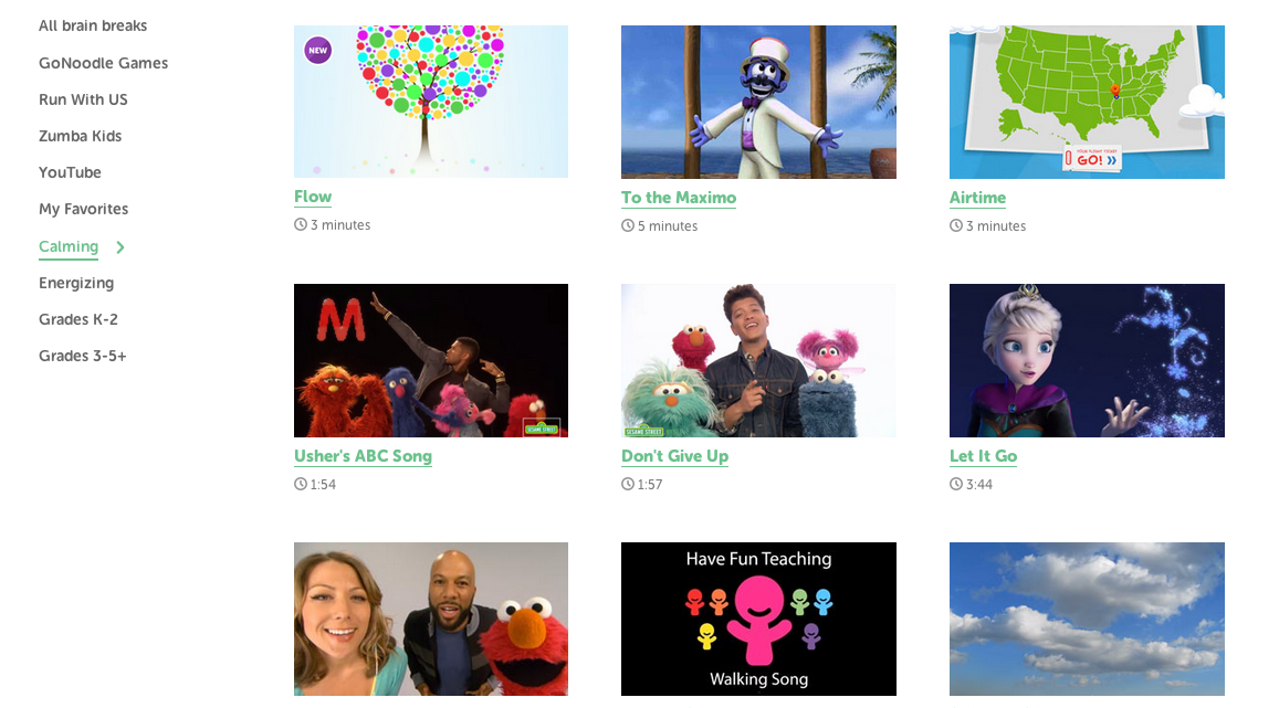 GoNoodle has a ton to choose from. From exercises, to dancing and music, to calming activities. Often we’ll get our wiggles out with a fun fast paced activity and then end with a calming minute or two. You can see there is an easy search on the side. Here are just a few activities in the K-2 section.