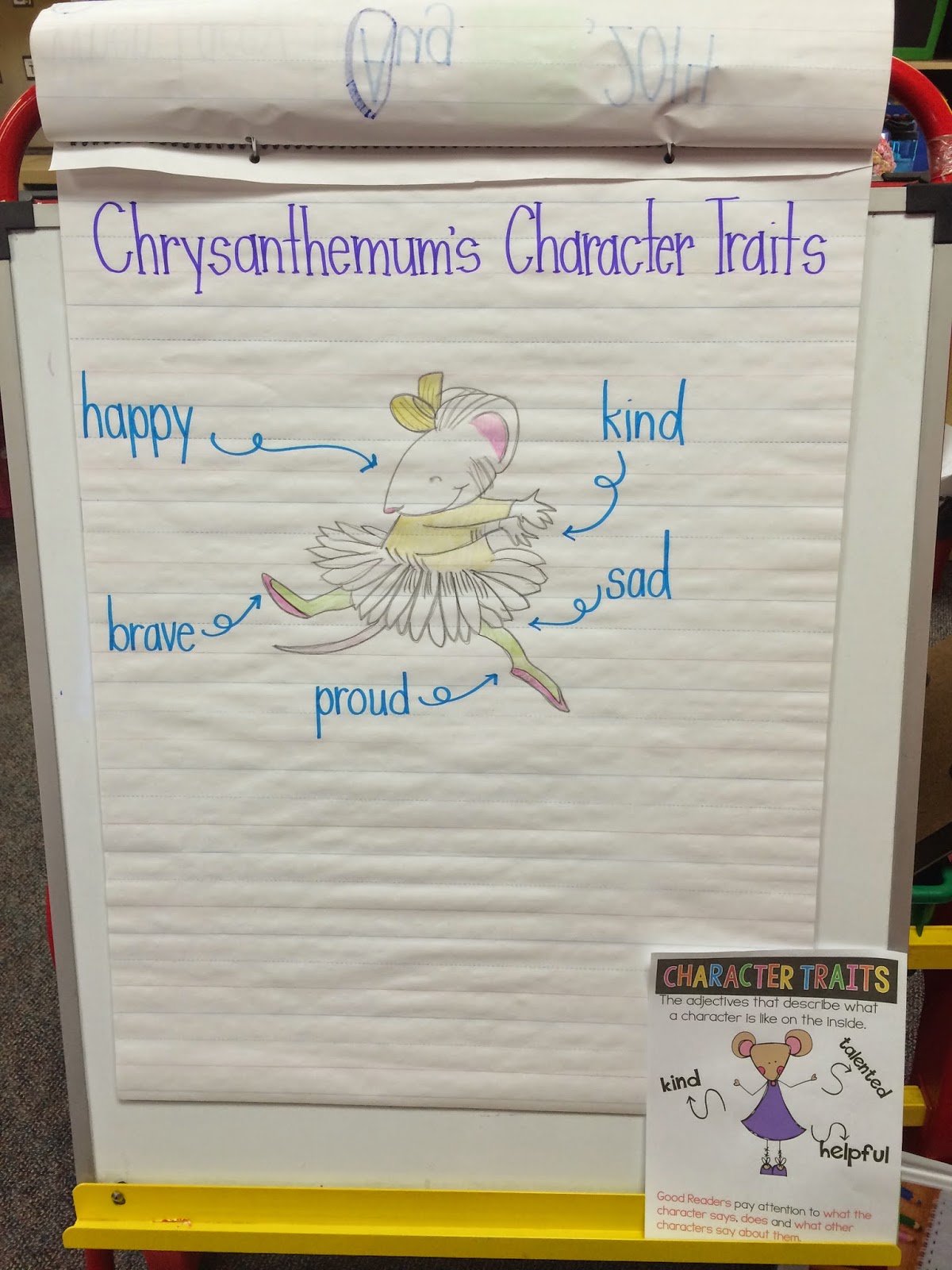 The next day we brainstormed Chrysanthemum’s character traits and gave reasons from the book to support our ideas. The students filled out their own character traits chart.