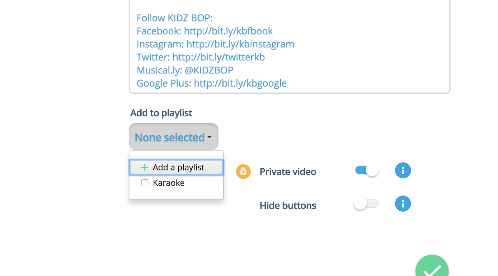 To add a video to the playlists you create, you add the video, then go to the bottom and select the playlist you want the video added to. After I check karaoke I simply hit the green checkmark and it will appear in the playlist.