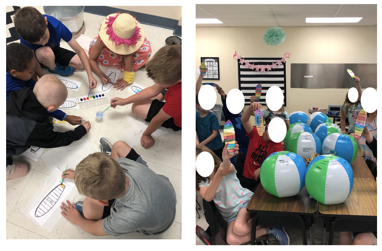 Students walked in and were greeted by 22 beach balls. At one point in our morning they used Sharpies to sign the beach balls. Then we painted surfboard bookmarks. When they dried, I laminated them for them and they cut them out as summer bookmarks.
