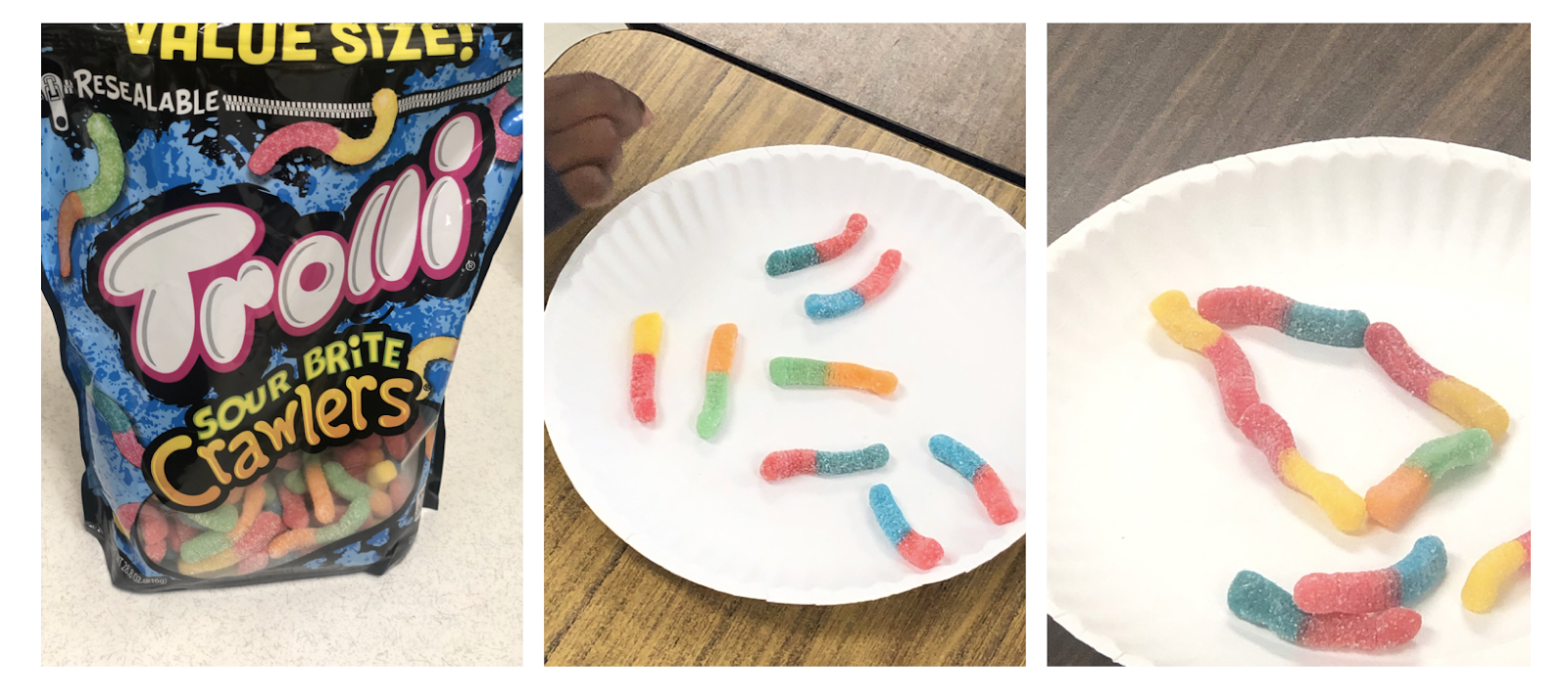 Kroger also had these gummy worms on sale for nothing, so I decided we would do a little math. My kiddos practiced geometry standards, as well as repeated addition before chomping worms from our “camping trip”.